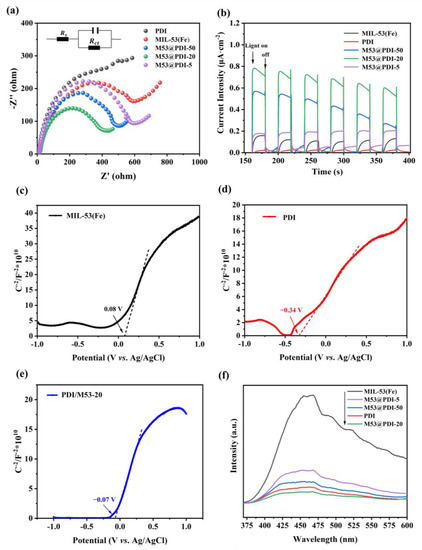 (a) EIS Nyquist plots and (b) transient photocurrent responses of the samples, Mott–Schottky plots of (c) MIL-53(Fe), (d) PDI and (e) M53@PDI-20 and (f) the steady-state photoluminescence (PL) spectra.
