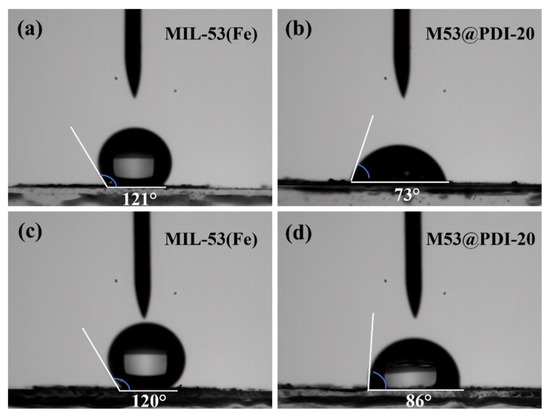 Images of contact angles of MIL-53(Fe) (a) and M53@PDI-20 (b) with 10 mg/L RhB solution; images of contact angles of MIL-53(Fe) (c) and M53@PDI-20 (d) with 10 mg/L Cr(IV) solution.