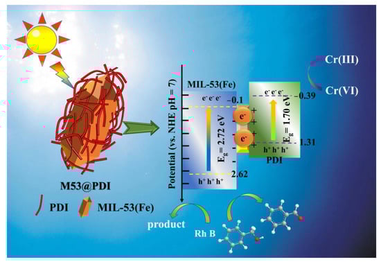 A possible photocatalytic mechanism over MIL-53(Fe)@PDI heterojunctions.