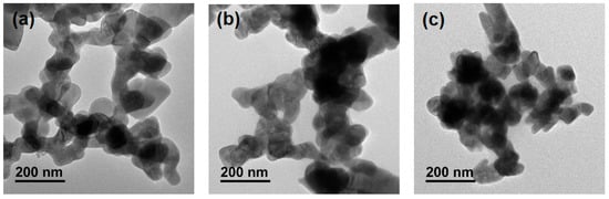 TEM micrographs of the three BiVO4-based powder samples are presented in Figure 2, showing the significantly granular morphology of the nanoparticles. The particle size of the sampled nanoparticles was estimated from the corresponding TEM images in ImageJ software, and the average particle sizes of the undoped, W-doped, and Mo-doped BiVO4 powder samples were determined to be 164, 137, and 135 nm, respectively (Table 1). Iwase et al. have reported that 1 mol% Mo- or W-doped BiVO4 particles prepared by an aqueous route possessed finer crystallinity than un-doped BiVO4 [16]. It was recognized that the as-synthesized BiVO4-based powders comprised nano-sized crystallites, and the average particle sizes of the two impurity-doped samples were finer than that of the undoped sample because the extrinsic doping caused lattice distortion and caused weak internal stress, which apparently led to inhibition of the crystal growth and thus reduced the growth rate.