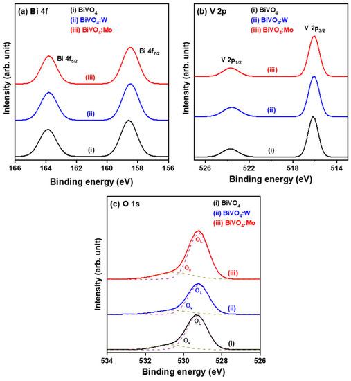 In the Bi 4f XPS spectra shown in Figure 3a, the two characteristic peaks located at binding energies of 158.6 eV and 163.8 eV corresponded to the Bi 4f7/2 and Bi 4f5/2 states, respectively, indicating that the oxidation state of Bi ions was +3 in the obtained oxide powders [13,23]. A strong V 2p3/2 peak and a weak V 2p1/2 peak were located at binding energies of approximately 516.2 eV and 523.8 eV (Figure 3b), representing the oxidation state of V ions of +5 [13,23]. Moreover, it was found that the characteristic peaks of Bi 4f7/2 and V 2p3/2 of the W- and Mo-doped BiVO4 samples slightly shifted toward the low binding energy region due to the impurity doping effect. As shown in Figure S2, the peaks of the W 4f XPS spectrum positioned at 34.9 eV and 36.9 eV were assigned to the W 4f7/2 and W 4f5/2 states (Figure S2a), and the characteristic peaks located at 231.9 eV and 235.1 eV exhibited in the Mo 2d XPS spectrum were consistent with the Mo 2d5/2 and Mo 2d3/2 states (Figure S2b) [11].