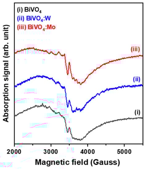 Electron spin resonance (ESR) measurement explores the energy absorption behavior of asymmetric electron orbitals under variations in the magnetic field and specific electromagnetic wave frequency. Figure 4 shows three ESR spectra obtained from the undoped and impurity-doped powder samples, revealing significant anisotropy owing to the nature of the crystal-field asymmetry [26]. It was found that the resonance field (Hr = 3384 Oe) and resonance linewidth (ΔH = 300 Oe) of the BiVO4:Mo sample were higher than those of the BiVO4 and BiVO4:W samples (Hr ~ 3372 Oe and ΔH ≤ 1000 Oe), indicating that the former possessed a higher magnitude of lattice distortion. The calculated results of the Landé g-factor for BiVO4, BiVO4:W, and BiVO4:Mo were 2.082, 2.083, and 2.074, respectively. The g-factor of the BiVO4:Mo sample was close to the g-factor values (2.00) in published reports [16].