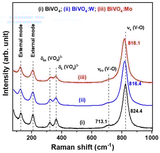 The chemical structures of the BiVO4-based nanoparticles were identified by the Raman analytical technique, and three Raman spectra are presented in Figure 5. The intense band centered at 824.4 cm−1 correlated with the symmetric V-O stretching mode (νs), and a weak signal located at the low wavenumber side shoulder (713.1 cm−1) was assigned to the anti-symmetric V-O stretching mode (νas) for the pristine crystalline BiVO4 particles [27]. The spectra related to the symmetric and anti-symmetric bending modes (δs and δas) of the vanadate anion (VO43−) were found at 363.4 cm−1 and 321.3 cm−1, respectively. In addition, two external modes attributed to rotation and translation were detected at 207.0 cm−1 and 121.7 cm−1, individually. It is well known that the Raman band position, namely the peak wavenumber of the Raman band, is strongly related to the short-range order, and also that the width of the Raman band, namely the full width at half maximum (FWHM), is sensitive to lattice defects and structural disorder, crystallinity, and particle size [8]. The peak position of the most intensive Raman band of the two impurity-doped powder samples shifted toward the low wavenumber side as compared with that of the un-doped powder sample (Figure 5 and Table 1), indicating that the short-range symmetric stretching mode of the VO4 tetrahedra in the structure of monoclinic BiVO4 turned into a more regular state [28]. The FWHMs of the most intensive Raman bands for the BiVO4, BiVO4:W, and BiVO4:Mo powder samples were 44.07, 48.37, and 48.87, respectively. That feature revealed that the value of FWHM significantly increased when a small amount of impurity dopant was incorporated into the BiVO4 crystals and caused slight lattice distortion.