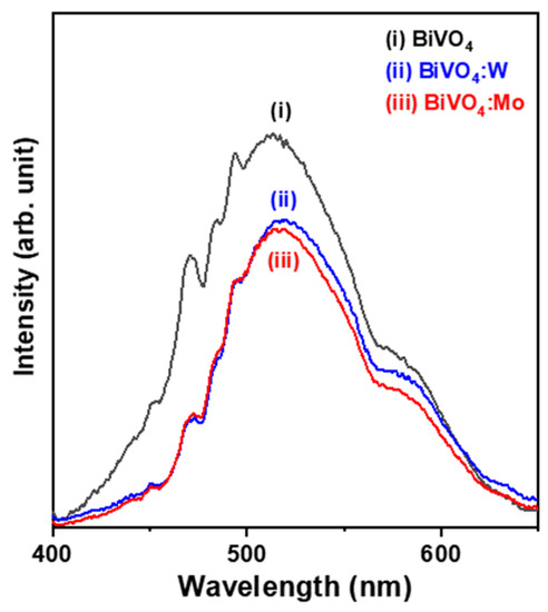 The fluorescence (FL) spectra of the three powder samples were obtained to characterize and explore the recombination rate of photogenerated electrons and holes [29]. As shown in Figure 6, the emission spectra exhibited a strong emission intensity at approximately 514–518 nm when excited by the near-UV light wavelength of 350 nm. The BiVO4:W and BiVO4:Mo powder samples had relatively lower emission intensities (spectra (ii) and (iii)), whereas the pristine BiVO4 powder sample possessed the strongest emission intensity (spectrum (i)). It is well agreed that a stronger FL emission intensity contributes to a higher recombination rate of photogenerated carriers [30]. Therefore, a lower FL intensity implies higher photogenerated electron–hole pair separation efficiency and thus higher photocatalytic activity [31].
