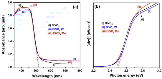 The BiVO4-based powder samples exhibited similar absorption spectra in the wavelength range of 300–800 nm, as shown in Figure 7a. Each absorption curve showed low absorption in the wavelength range of 600–800 nm; displayed a steep shape absorption feature, representing the absorption edge, within the range of 450–520 nm; and showed a strong absorption ability in the measured wavelength region shorter than 450 nm. The nature of the absorption edge is attributed to the band-to-band transition of direct bandgap semiconductor materials, whereas the absorption bands contained a slight tail extending to the right-sides until approximately 550 nm. This feature resulted from defects in the BiVO4-based crystals. In addition, it was found that the absorbance magnitudes of the impurity-doped powder samples (curves (ii) and (iii)) were twice as high as that of the un-doped powder sample (curve (i)) in the 600–800 nm region due to the former exhibiting an irregular particle morphology and possessing a much larger specific surface area.