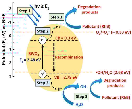 The proposed photocatalytic reaction principle and mechanism [1] of a BiVO4 photocatalyst under visible light illumination are illustrated in Figure 8. Knowing the relative positions of the VB and CB potentials of the oxide semiconductor with respect to the potentials of •OH/H2O and O2/•O2− is helpful to understanding the photocatalytic reaction procedures and mechanisms. The positions of the conduction band minimum (CBM) and valence band maximum (VBM) are +0.3 eV and +2.78 eV, respectively [33,34]. In addition, the potential for the generation of •OH [•OH/H2O] radicals is +2.68 eV for a normal hydrogen electrode (NHE) and that for •O2− [O2/•O2−] radicals is +0.13 eV for an NHE [35]. Under the excitation of visible light, the photogenerated electrons transition from the VB to the CB of the BiVO4 semiconductor, and photogenerated holes remain in the VB due to electron deletion. Photogenerated electrons and holes then migrate to the surface of the BiVO4 nano-sized semiconductor. Subsequently, photogenerated electrons reduce O2 to •O2− and photogenerated holes convert H2O into •OH. Both •O2− and •OH support the photodegradation of RhB.