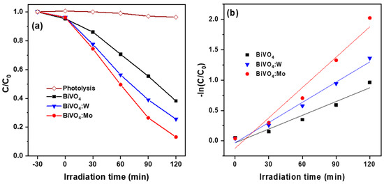 The photocatalytic degradation rate of diluted RhB solution as a function of visible light illumination time for the three BiVO4-based nanoparticles is shown in Figure 9a. Notably, the degradation of RhB dye by visible light irradiation was negligible due to its relatively stable structure, and the dark adsorption ability of these BiVO4-based photocatalysts was approximately 4% (after standing in the dark for 30 min). For each mixed suspension, after visible light illumination for 120 min the photocatalytic activity efficiencies of different photocatalysts were found to be as follows: BiVO4:Mo (86.8%) > BiVO4:W (74.4%) > BiVO4 (61.8%). The RhB solution degradation efficiency of the undoped BiVO4 nanoparticles in this study is higher than that of hydrothermally synthesized pure BiVO4 microcrystals reported by Tian et al. (55.9%) [20] and comparable to the photocatalytic activity of mBiVO4 hollow microspheres with the pH of the reaction solution controlled at 4 (70%) [3]. Based on the above evaluation and analysis, it is found that a small amount of Mo doping is a simple and effective approach to significantly improve the photocatalytic activity.