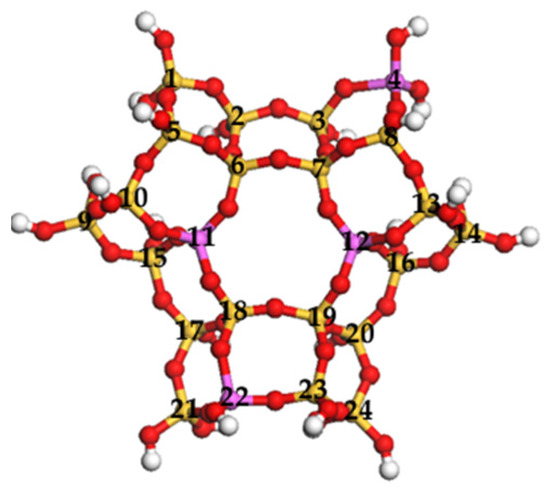 To better represent the structure of Y zeolite in experiments, four Si atoms of the Y zeolite cluster were substituted by four Al atoms according to the Lowenstein–Dempsey rules. The Y cluster with four Si atoms replaced by Al atoms was denoted as Y4−. Based on the 24T cluster model of Y zeolite, the most stable configurations of Y4− cluster was obtained by evaluating the substitution energy [45] and binding energy of Y4−, which are defined as