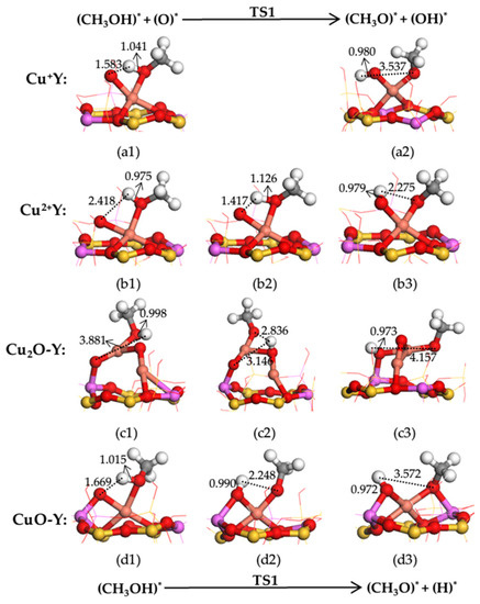 The structures of reactants, products and transition states on Cu+Y, Cu2+Y, Cu2O-Y and CuO-Y zeolite for the oxidation of CH3OH to CH3O (unit: Å). (a1) (CH3OH)*/(O)* on Cu+Y, (a2) (CH3O)*/(OH)* on Cu+Y, (b1) (CH3OH)*/(O)* on Cu2+Y, (b2) TS1 on Cu2+Y, (b3) (CH3O)*/(OH)* on Cu2+Y, (c1) (CH3OH)*/(O)* on Cu2O-Y, (c2) TS1 on Cu2O-Y, (c3) (CH3O)*/(OH)* on Cu2O-Y, (d1) (CH3OH)*/(O)* on CuO-Y, (d2) TS1 on CuO-Y and (d3) (CH3O)*/(OH)* on CuO-Y. See Figure 4 for the color coding.