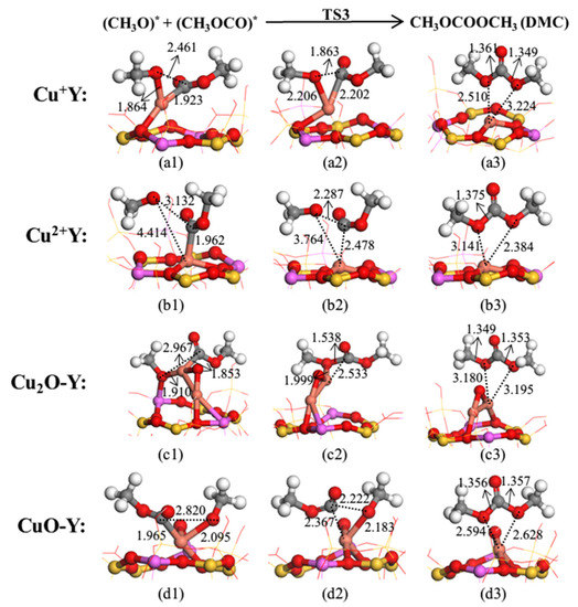 The structures of reactants, products and transition states on Cu+Y, Cu2+Y, Cu2O-Y and CuO-Y zeolite for the formation of DMC via path I (unit: Å). (a1) (CH3O)*/(CH3OCO)* on Cu+Y, (a2) TS3 on Cu+Y, (a3) DMC on Cu+Y, (b1) (CH3O)*/(CH3OCO)* on Cu2+Y, (b2) TS3 on Cu2+Y, (b3) DMC on Cu2+Y, (c1) (CH3O)*/(CH3OCO)* on Cu2O-Y, (c2) TS3 on Cu2O-Y, (c3) DMC on Cu2O-Y, (d1) (CH3O)*/(CH3OCO)* on CuO-Y, (d2) TS3 on CuO-Y and (d3) DMC on CuO-Y. See Figure 4 for the color coding.
