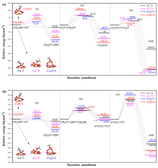 where EAB/CuY is the total energy for the product AB on CuY zeolite, EA+B/CuY is the total energies of the co-adsorbed A and B on CuY zeolite and ETS/CuY is the total energy of the transition state (TS) on CuY zeolite, respectively. The negative ΔH represents an exothermic reaction.