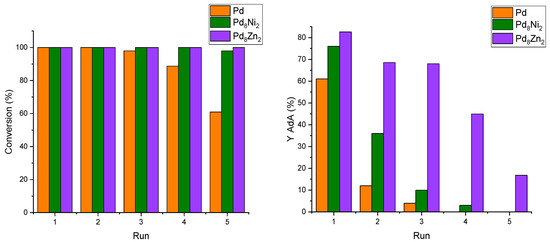 Finally, to study the catalyst stability, recycling tests were performed by recovering the catalyst and running up to five repeated reactions. Every reaction was carried out for 2 h, after which the solid catalyst was recovered by filtration and, without washing, fed back into the reactor to be reused in the next reaction. As expected, monometallic Pd, underwent degradation from the third run onwards (Figure 4). Differently, P8Ni2 and Pd8Zn2 catalysts maintained 100% of MA conversion for up to five consecutive reactions (Figure 4, left).