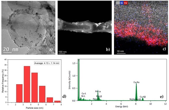 The catalysts’ morphology, particle size distribution, and metals ratio were evaluated by TEM and HAADF-STEM analyses. The bimetallic catalysts showed an average particle size of 4.1 ± 1.1 nm and 4.3 ± 0.9 nm, respectively, for Pd8Ni2 (Figure 5a,b) and Pd8Zn2 (Figure 6a,b), with a narrow particle size distribution. These values were in agreement with what was usually obtained with the sol immobilization technique and they were comparable with the value of 3.9 ± 1.2 nm obtained from the analysis previously made on Pd/HHT [13].