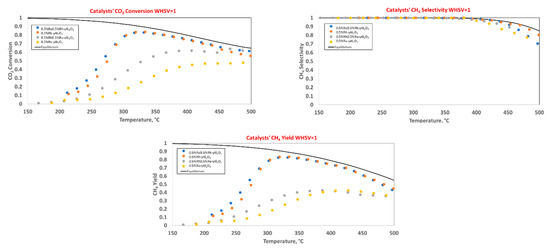 - Quindimil, A.; De-La-Torre, U.; Pereda-Ayo, B.; Davó-Quiñonero, A.; Bailón-García, E.; Lozano-Castelló, D.; González-Marcos, J.A.; Bueno-López, A.; González-Velasco, J.R. Effect of metal loading on the CO2 methanation: A comparison between alumina supported Ni and Ru catalysts. Catal. Today 2020, 356, 419–432. [Google Scholar] [CrossRef]