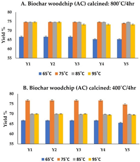Biodiesel yield (%) obtained at various reaction temperatures (°C) of biochar woodchip.