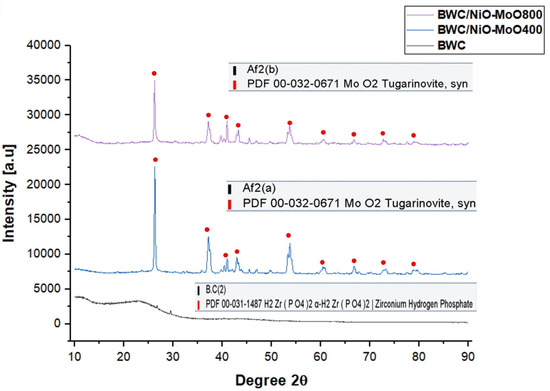 The sharpest peak observed for the woodchip biochar is 26,0° at 2θ. The higher the crystallinity degree of the fibrous-like structure, the sharper the diffraction peak. The XRD pattern of the woodchip biochar calcined at 400 °C and 800 °C for 4 h and fresh woodchip biochar is shown in Figure 3. The XRD peak distance in the adjacent graph is attributed to high crystallinity which is a clear hallmark of nickel and molybdenum metal integration. Based on the graph, there is a significant difference in the chemical composition in woodchip biochar before and after calcination (Figure 3). The data analysis revealed intense MoO2 peaks with different classifications of molybdenum states visible for all samples. The states represent molybdenum tugarinovite (BWC/NiO-MoO800) at (2θ = 26.00°, 31.50°, 37.30°, 41.50°, 49.50°, 54.00°, 60.00°, 66.50°, and 78.00°]). Whilst, for BWC/NiO-MoO400 the peak was observed at (2θ = 26.00°, 31.50°, 37.00°, 42.00°, 49.00°, 54.00°, 60.00°, 66.50°, 72.00° and 78.00° (PDF card no: 00-032-0671)) as shown in Figure 4.