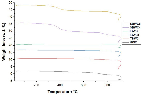 As shown in Figure 4, lignin did not show a well-defined degradation peak. On the contrary, the degradation process started at 100 °C and continued gradually up to 800 °C, a temperature at which more than 80 wt.% of the initial mass had been decomposed [28], corresponding to approximately 15 wt.% of the total weight of the raw material. As can be seen in the TGA, a large part of the weight loss had already occurred in BWC at 748 °C which indicated that the sample consisted mainly of water, lignin, cellulose, and hemicellulose. The significant thermal degradation of BWC started at 748 °C and continued gradually up to 890 °C which was a loss of about 83 wt.% of the initial mass. Finally, at 800 °C, there was still less than about 10 wt.% of fresh biochar undegraded by pyrolysis, which corresponds to the carbon and metallic residues.