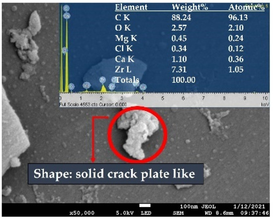 The FESEM micrographs of the catalyst and CaO produced from the woodchip biochar are shown in Figure 5. The morphology of CaO, which was isolated using acid pre-treatment under reflux and subsequently purified, is also shown in Figure 5. The typical drying procedure that utilises universal oven heating at 100 °C transformed the treated biochar morphology into solid crack with a plate-like structure (Figure 6A,B). The morphology of the catalyst, as seen in the figure, showed no aggregation of biochar with the indicated transition metal. However, during the wet impregnation procedure the particles were well scattered.