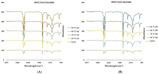 Chemical functional groups of triglycerides and transesterified products at (A) 800 °C and (B) 400 °C under FTIR analysis.