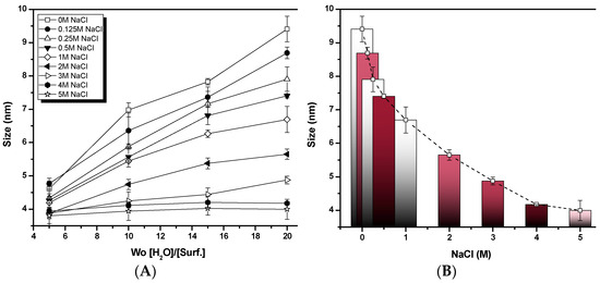 Other experimental approaches suggest that [41,45,58] two different regions with divergent water structures may exist in the polar core of the reverse micelle, where one region, with reduced mobility, has a structured water layer around the polar heads of the surfactant, while the other region consists of free-spinning bulk water in the hydrophilic inner core of the reverse micelle. According to Figure 1A,B, it is evident that with increasing NaCl concentration in the reverse micellar systems, the size distribution decreases even at the maximum limit of the aqueous content (Wo = 20), where this behavior is remarkably different in Figure 1B across all NaCl variations at the maximum aqueous content (Wo = 20) and which has the highest statistically significant difference (p < 0.05). The screening of this behavior started by supplying low concentrations of NaCl (0.125, 0.25, and 0.5 M) in the phosphate buffer, where it is possible to notice that by slightly increasing the concentration of the electrolyte (NaCl) in the aqueous phase of the reverse micelles, a reduction in the distribution of the average sizes is observed (Figure 1A). The first evidence described above suggested that the presence of NaCl can have several effects on the hydrophilic core of the reverse micellar systems, such as the exchange between favoring or limiting their dissolution by reverse micelles [59].