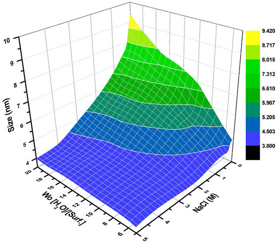 Extrapolating the previous descriptions, in Figure 2 it is possible to notice that with the characterization of the range average size distribution of the reverse micelles in the concentrations with excess electrolyte (NaCl > 1 M), the behavior maintained a relative linearity between the increases of the aqueous content (Wo). In general, the average distribution of the reverse micelle sizes was observed to decrease as a function of increasing NaCl concentration (Figure 2). According to the increase of NaCl, significant changes (p < 0.05) in the sizes are observed and are interesting in parallel with the increase of aqueous content.