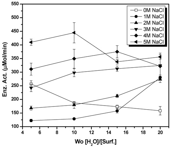 High cation concentrations in halotolerant and halophilic organisms may, in part, be necessary to protect the negative charges on the protein surface, since otherwise the denaturation phenomenon at NaCl/KCl concentrations below 1 M may be irreversible [77,79]. Thus, the high density of negative charges on the surface of these enzymes increases the electrostatic repulsion between them and prevents the formation of aggregates and precipitates allowing them to remain soluble at concentrations at which most enzymes would aggregate [84,85,86,87]. Given the above descriptions, it is believed that gradual changes in the transition states of CalB might be occurring in Figure 2 due to the increase of solubilized NaCl in the polar core of the reverse micelles; however, at 5 M NaCl it is noticeable that, being close to the solubility limit of NaCl, CalB reaches the highest enzymatic activity (444.85 37.40) at Wo = 10 for this particular reverse micellar system. However, as Wo increases, a significant decrease in enzyme activity is observed (Figure 3).