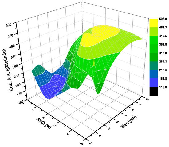 Figure 4 shows the convergence of the results obtained by DLS and enzymatic activity in the AOT/Water/Isooctane reverse micellar system, where the variation of NaCl unfolds an effect on the reverse micelle sizes. In this sense, it is evident that reverse micelles provide stability in the encapsulation of halotolerant biocatalysts due to their high surface area, which can be controlled as a function of water content (Wo) and electrolyte content (NaCl), and tailor specific size dimensions according to the operational requirements of the enzyme. The premise of this hypothesis relies on the use of these nanoreactors in order to reduce the limitations of mass transport phenomena and increase the operational surface area and, thus, increase the synthesis titers in halotolerant and halophilic enzymes. Therefore, the reverse micelles described in this research work showed relative increase of diffusion characteristics with effect on the enzymatic activity (Figure 4) of CalB protected in these nanoscale reactors [93,94], where these systems showed the functionality of increasing the operative surface area.