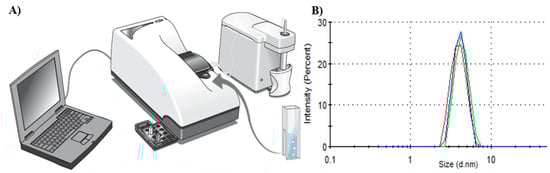 The size distribution was estimated employing the Malvern ZetaSizer Nano ZS90 (Malvern Instruments, Ltd., Malvern, UK), with 12.5 mm plastic cells (Sigma-Aldrich, St. Louis, MO, USA) resistant to solvents (Figure 6A). Dynamic light scattering (DLS) allows measurement of Brownian motion in relation to particle size. Through this spectroscopic correlation, the particles are illuminated with lasers, and the intensity fluctuations of the scattered light are analyzed [99,100].