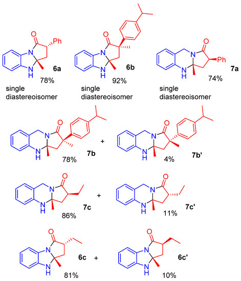 Contemporaneously, Patil and col. reported the cascade reaction of alkynoic acids with phenylenediamines or o-aminobenzylamines in the presence of 1 mol% of Ph3PAuOTf catalyst. Considering the substitution at the aromatic ring of these nucleophiles, the excellent regioselectivity observed for the 37 tri- and tetracycles obtained was attributed to the difference in nucleophilicity between amino groups. When α- or α,α′-substituted pentynoic acids were employed, the corresponding dihydrobenzimidazoles 6 and tetrahydroquinazolines 7 were obtained with good to excellent diastereomeric ratios (Figure 2), which was confirmed by NOE studies. In addition, the authors provided an alternative procedure based on microwave irradiation in the same solvent (1,2-dichloroethane), thus enhancing the reaction rate in comparison with conventional heating (30 min vs. 24 h). Finally, several mechanistic studies were conducted in order to shed light not only on the role of the Au(I) catalyst and the possible participation of Brönsted acid TfOH but also on the reason for the diastereoselectivity observed [58].