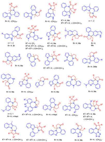 In many cases, as a result of the above cascade reactions starting from alkynoic acids, analogs and isosteres of a number of pharmacologically relevant compounds have been straightforwardly prepared. Among others, tetrahydro-γ-carbolines (e.g., Gevotroline, Tubastatin A and Dimebon), identified as potent immunosuppressants and neuroprotective agents [31,32,33,34,35,36,37,38]; actinophenanthrolines [39] and quinazoline alkaloids such as Vasicine (peganine), Mackinazolinone, Batracyclin and Tryptanthrin that exhibit anticancer, anti-inflammatory, antiprotozoal, antiallergic, antioxidant and antimicrobial activities [40,41,42,43,44,45,46,47] (Figure 1).