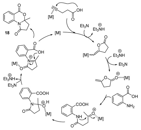 In order to determine the role of the catalysts in this cascade reaction, the authors carried out a series of experiments. 5-Methylenedihydrofuran-2(3H)-one was easily prepared by reacting 4-pentynoic acid with the above NNC complex (10−2 mol%) and triethylamine (2 mol%) in dichloromethane at room temperature and then treated with anthranilic acid under the optimized reaction conditions to provide target benzo[d]pyrrolo[2,1-b][1,3]oxazine-1,5(2H)-dione 18 in 90% yield. The kinetic plot of the conversion of anthranilic acid vs. time showed neither sigmoidal shape nor induction time, and when the reaction was performed in the presence of several poisoning agents (mercury drop test, carbon disulfide and polyvinylpyridine, among others), no inhibition was observed, thus suggesting the participation of truly homogeneous catalytic species in the reaction. The absence of palladium nanoparticles, as determined by TEM-EDX analysis of the reaction mixture, provided additional proof to confirm the hypothesis of homogeneous catalysis. Moreover, some key intermediates were detected by UPLC-MS of the reaction mixture. Accordingly, a more nuanced mechanism describing the role of the metal species and transient intermediates detected by UPLC-ESI was also proposed [79] (Figure 4). These results are in accordance with several examples of bimetallic co-catalysis, including the aforementioned reports on the gold-silver co-catalyzed cascade reactions (Section 2.2 and Section 2.3, Scheme 3, Scheme 6 and Scheme 7) [53,57,61] and other accounts on metal-metal synergistic effects and metal–ligand cooperation [80,81,82].