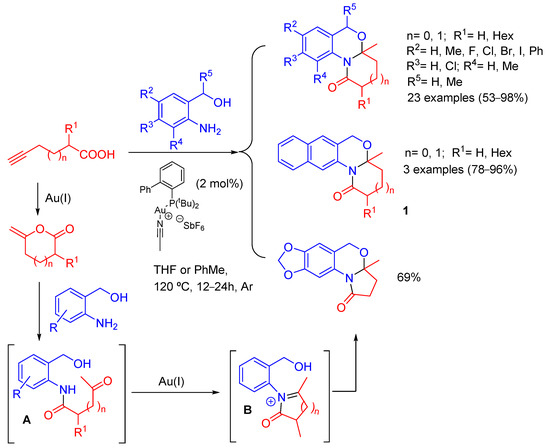 A large variety of pyrrolo- and pyrido[2,1-b]benzo[d][1,3]oxazin-1-ones 1 were synthesized by Liu and col. from o-aminobenzyl alcohols and 4-pentynoic- and 5-hexynoic acids in the presence of a 2 mol% of [Au{P(t-Bu)2(o-biphenyl)}{CH3CN}]SbF6. Tetrahydrofuran (THF) was the solvent of choice when dealing with most of the 4-pentynoic acid derivatives, while toluene was employed for reactions with 5-hexynoic acid. Regarding the reaction mechanism, the authors proposed that, after the initial cycloisomerization step, nucleophilic attack by the amino group generates a ketoamide intermediate A that, upon intramolecular condensation and the formation of the corresponding N-acyliminium ion B, undergoes nucleophilic attack by the carbinol moiety, thus providing tri- and tetracycles 1 with good yields [55] (Scheme 4).