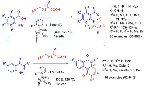 Almost simultaneously, this group reported the use of o-aminobenzoic acids and o-aminobenzamides as dinucleophiles to generate pyrrolo/pyrido[2,1-a][1,3]benzoxazinones and pyrrolo/pyrido [2,1-a]quinazolinones 2. After a screening of different Au(III) and Au(I) sources, the same catalyst system was employed, although, this time, in 1,2-dichloroethane (DCE) was the solvent. It was confirmed not only that the reaction system was not sensitive to air and moisture at low catalyst loadings (1.5 mol%) but also that no silver salt or Brönsted acid (AgSbF6 or CF3COOH, respectively) was required to obtain optimal results or shorter reaction times. A similar mechanism was proposed for this transformation that took place at the same temperature (120 °C, Scheme 5) [56].