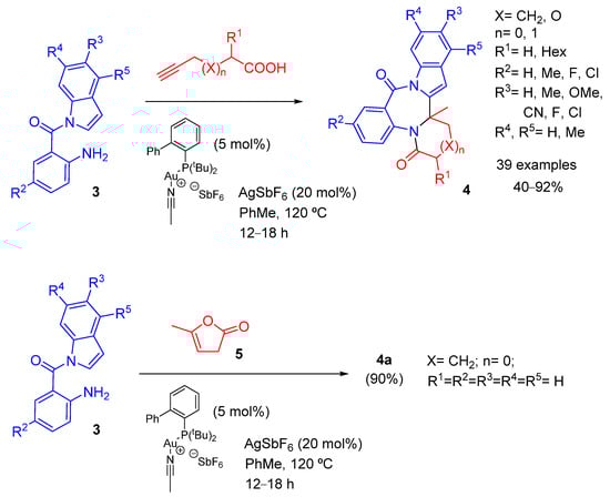 In 2011, another type of dinucleophiles, (2-aminophenyl)(1H-indol-1-yl)methanone derivatives 3, was reacted with pentynoic, hexynoic and 2-propargyloxyethanoic acids. In this case, [Au{P(t-Bu)2(o-biphenyl)}{CH3CN}]SbF6 was combined with AgSbF6 for optimal results in toluene as a solvent, thus obtaining benzo[e]indolo[1,2-a]pyrrolo[2,1-c][1,4]diazepine-3,9-diones and benzo[e]indolo[1,2-a]pyrido[2,1-c][1,4]diazepine-3,9-diones 4 with good yields. In order to prove the proposed mechanism, the authors reacted alfa-angelica lactone 5 (5-methyl-2(3H)-furanone) with dinucleophile 3 under the optimized reaction conditions, and the corresponding benzo[e]indolo[1,2-a]pyrrolo[2,1-c][1,4]diazepine-3,9-dione 4a was obtained in 90% yield [57] (Scheme 6).