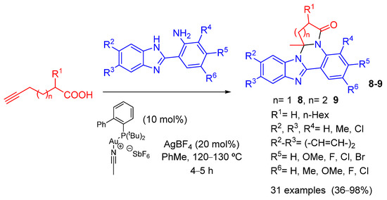 The same group reported the preparation of 31 benzo[4,5]imidazo[1,2-c]pyrrolo[1,2-a]quinazolinones 8 by reacting 2-(1H-benzo[d]imidazol-2-yl)anilines with 4-pentynoic acids in the presence of 10 mol% of [Au{P(t-Bu)2(o-biphenyl)}{CH3CN}]SbF6 and 20 mol% of AgBF4 in toluene at 120–130 °C. These optimized conditions were determined by testing a number of Au(I) and Ag catalysts, including AuCl(PPh3), AgSbF6, and AgBF4, among others. Possible additive effects from the combination of cocatalysts (AgSbF6, AgBF4, AgO2CCF3, AgOTf, and trifluoroacetic acid) were also examined. The authors studied the influence of the substituents at both the benzoimidazole and aniline moieties in the reaction outcome. In this regard, they observed that the presence of electron-donating substituents such as methyl or methoxy at the aniline moiety, and specially at the ortho-position (R4 substituent, Scheme 7) caused a substantial decrease in the reaction yield. A similar effect related to the presence of methyl or chloro groups at the benzimidazole moiety of the 2-(1H-benzo[d]imidazol-2-yl)aniline reagent was also observed (R2 and R3 substituents). A decreased yield could be attributed to a possible steric hindrance when using α-substituted 3-ethynylnonanoic acid was also accounted for. When the optimized protocol was applied to 5-hexynoic acid, the corresponding benzo[4,5]imidazo[1,2-c]pyrido[1,2-a]quinazolin-6-ones 9 were obtained, albeit in lower yields than those from 4-pentynoic acid, even at slightly higher temperatures (130 °C). The same decreasing effects related to the presence of R2-R3 substituents at the benzimidazole moiety, and R4-R6 at the aniline fragment of the 2-(1H-benzo[d]imidazol-2-yl)aniline N-aminonucleophile were noticed, with 5-hexynoic acid as the counterpart [61] (Scheme 7).