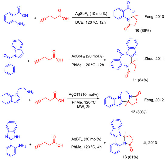 Among different coinage and precious metal catalysts, AgOTf (1 mol%) was tested to promote reaction between phenylene diamine and 4-pentynoic acid in 1,2-dichloroethane (DCE) at 100 °C, and the corresponding tetrahydro-1H-benzo[d]pyrrolo[1,2-a]imidazol-1-one was obtained by Patil and col. with a moderate 40% yield [58]. Increasing the amount of AgSbF6 catalyst to a 10 mol% allowed Liu and col. to prepare benzo[d]pyrrolo[2,1-b][1,3]oxazine-1,5(2H)-dione 10 with an 80% yield from anthranilic and 4-pentynoic acids (Scheme 9) [56]. The same group also tested several Ag(I) salts to synthesize benzopyrrolo[2′,1′:3,4][1,4]diazepino[1,2-a]indole-3,9(2H)-dione 11 by reacting 4-pentynoic acid and (2-aminophenyl)(4-methyl-1H-indol-1-yl)methanone. Although a 5 mol% of AgOTf, AgBF4 and AgSbF6 in toluene provided target compound with moderate results (45–50%), the yield rose to 84 when a 20 mol% of AgSbF6 was employed (Scheme 9) [57]. Another C-aminonucleophile, 2-(1H-indol-1-yl)ethan-1-amine, was reacted with 4-pentynoic acid to provide tetrahydropyrrolopyrazino[1,2-a]indolone 12 in the presence of AgOTf or AgSbF6 (Scheme 9) [60]. Structurally related 2-(1H-indol-2-yl)ethanamine, which could act as both C-amino- and N-aminonucleophile, was also reacted using AgOTf and AgSbF6 catalysts [62]. Finally, dihydrobenzo[4,5]imidazo[1,2-c]pyrrolo[1,2-a]quinazolin-3(2H)-one 13 was obtained with a good yield (81%) when 2-(1H-benzo[d]imidazol-2-yl)aniline was employed as N-aminonucleophile, although catalyst loading was increased to a 30 mol% (Scheme 9) [61].