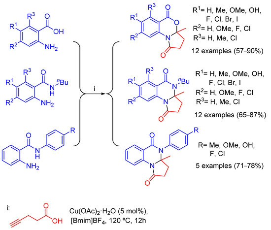 After a screening of different copper sources and reaction media, Reddy and col. discovered that the cascade reaction between 4-pentynoic acid and 2-aminobenzyl alcohol could be carried out using a 5 mol% of a cheap and available copper(II) salt, Cu(OAc)2·H2O in [bmim]OTf ionic liquid, at 100 °C. Several 2-aminobenzyl alcohols were then reacted with 4-pentynoic and 5-hexynoic acids to provide the corresponding benzo[d]pyrrolo- and benzo[d]pyridooxazin-1-ones with good yields (63–95%). They proved that this catalyst-solvent system was responsible for the initial cycloisomerization process as well as for the subsequent condensation reactions with the resulting alkylidene lactone [64]. In 2017, the same group described a similar regioselective process conducted with anthranilic acid and 2-aminobenzamide derivatives as aminonucleophiles. Good to excellent yields were obtained in all cases (Scheme 10), and the authors successfully recycled and reused the catalytic system (copper salt and ionic liquid) for five times without significant loss of the catalytic activity. Regarding the reaction mechanism, the authors described a similar pathway to that proposed in their initial paper [65].