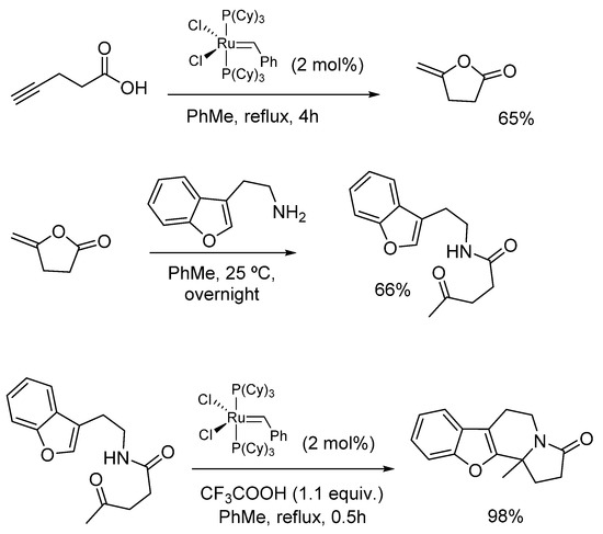 5.2. Cascade Reaction of Alkynoic Acids and Aminonucleophiles in the Presence of Ruthenium Carbenes