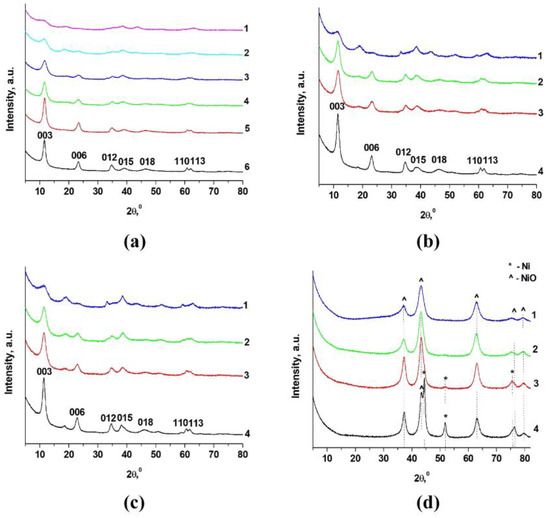 According to XRD data for (Ni + Mg)/Al = 2 and Ni/(Ni + Mg) = 0.1, 0.3, and 0.5, the reflexes of the LDH phase are observed (Figure 1a). Peaks 003 and 006 are observed in the low angles area (2θ = 5 ÷ 30°), reflections 012, 015, and 018 are in the area of medium angles (2θ = 30 ÷ 55°, and peaks 110 and 113 are in the region of high angles (2θ = 55 ÷ 80°). The increase in Ni/(Ni + Mg) from 0.5 to 1.0 lead to the decrease in the intensity of the LDH peaks. Moreover, the additional peaks at approximately 18° and 38° appeared. These peaks are attributed to gibbsite and theophrastite. The increase in Ni content leads to decrease of crystallinity of the samples. Also, there was no complete reaction between initial reagents as the Ni content increased. Therefore, the peaks of Al(OH)3 and Ni(OH)2 were in the XRD patterns of corresponding samples. A similar trend of changes in XRD patterns was observed for the samples with molar ratio of (Ni+Mg) = 3 and 4 (Figure 1b,c).