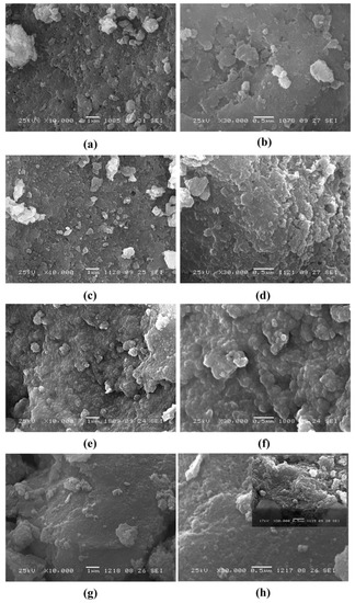SEM images of the samples: (a,b) NiAl-3, (c,d) NiAl-4, 3, (e,f) 0.5NiMgAl-4, 4, (g,h) 0.3NiMgAl-4.