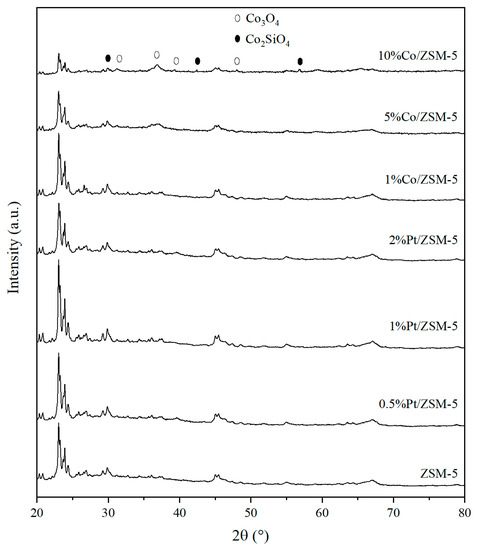XRD patterns of the Co- and Pt-doped ZSM-5 catalysts.