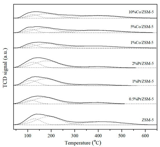 NH3-profiles of the Co- and Pt-doped ZSM-5 catalysts. The deconvoluted peaks are shown as dashed lines.