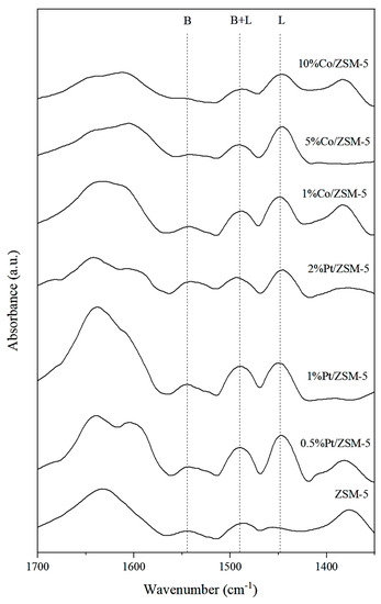 FT-IR spectra of pyridine adsorbed the Co- and Pt-doped ZSM-5 catalysts.