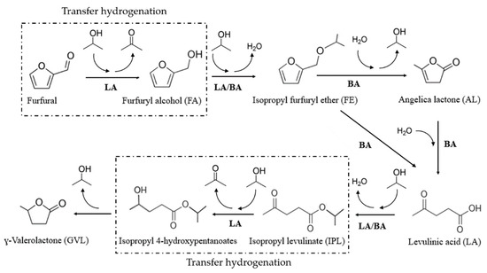 Reaction networks for the one-pot conversion of furfural to GVL (BA: Brønsted acid, LA: Lewis acid). Reaction conditions: 0.5 mmol of furfural in 10 g of 2-propanol at 120 °C under 0.1 MPa N2 with 0.2 g catalyst.