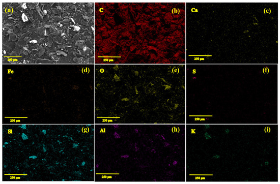 It is useful to provide insights on to the chemical and microchemical composition of the NG used as the raw material in this research. Figure 2 shows the SEM/EDS element mapping analysis recorded on the sample. As can be seen from Figure 2a, the material contains graphitic flakes with lateral dimensions typically larger than 20 μm. According to the EDS analysis, in addition to carbon, other elements comprising Ca, Fe, O, S, Si, Al, and K could also be detected, indicating the impurity of the natural graphite material.