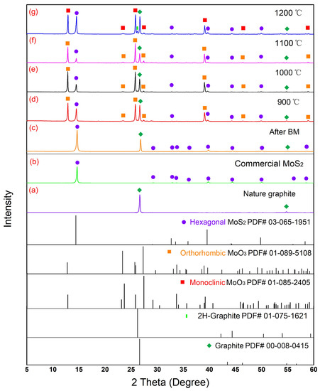 XRD patterns of various precursor materials and products: (a) the non-purified natural graphite material, (b) the commercial MoS2, (c) the mixture after ball milling; and (d–g) nanostructured materials obtained at various temperatures.