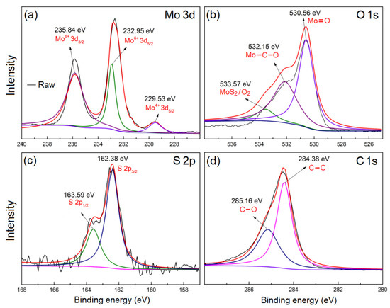 The structural and microstructural characterizations mentioned above could demonstrate the formation of MoO3 nanoribbons incorporated into hexagonal MoS2 and graphene. The Li-ion storage performance of the products will be evaluated shortly in this article. However, before that, it would be interesting to shed light on to nature of the interface between the above mentioned phases. This was examined using XPS analysis, as shown in Figure 5. As can be observed, the characteristic peaks of Mo, O, S and C are debatable in the XPS spectrum of MoO3/MoS2@G-1100. High-resolution XPS spectra obtained on Mo 3d, O 1s and S 2p peaks are exhibited Figure 5a–c. As observed, the strong peak at 229.53 eV corresponds to Mo4+ 3d3/2, and peaks at about 163.1 eV and 161.5 eV to S 2p1/2 and S 2p3/2, respectively, revealing the existence of MoS2 [40,41]. On the other hand, the peaks located at 235.79, 232.95, 530.56 and 532.15 eV correspond to the Mo6+ 3d3/2, Mo6+ 3d5/2. These peaks together with that appeared at 530.65 eV (corresponding to O1s components) indicate the presence of MoO3 [27]. Moreover, the C 1s core level shown in Figure 5d could be deconvoluted into two peaks at 284.38 and 285.16 eV, which originate from the C–C and C-O bonds, respectively [41]. The presence of C-C bond is related to the graphene nanosheets, and C-O bond to the local interaction between graphene nanosheets and MoO3.