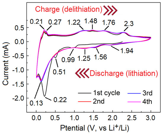 Figure 8 shows the CV curve of the MoO3/MoS2@G-1100 electrode, providing detailed information about the Li-ion insertion and extraction processes. During the first cathodic scan, there is a cathodic peak at 0.56 V. This cathodic event cannot be observed in the subsequent cycles, providing evidence that this peak mainly corresponds to the formation of SEI. Moreover, the presence redox peaks at 1.56/1.76 V and 1.25/1.48 V in the first cycle can be related to the lithiation and delithiation of MoO3, and to the metallization/oxidation of metallic molybdenum: