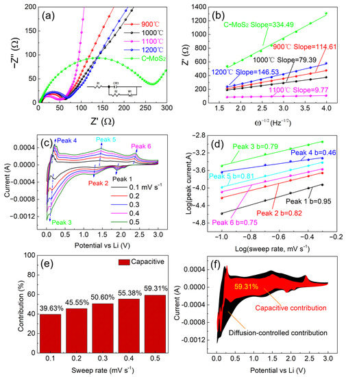 (a) AC impedance spectra of MoO3/MoS2@G and C-MoS2 electrodes. (b) The values of Z′ vs. ω−1/2 (ω = 2Πf) for MoO3/MoS2@G and C-MoS2. (c–f): Contribution of pseudocapacitive Li-ion storage to the total capacity of the MoO3/MoS2@G-1100 electrode: (c) CV curves with scan rates raging 0.1 to 0.5 mV s−1; (d) the logarithmic dependence between the peak current and sweep rate; (e) contribution of pseudocapacitive and diffusion-based processes to the total current at different sweep rates, and (f) the pseudocapacitive contribution at 0.5 mV s−1.