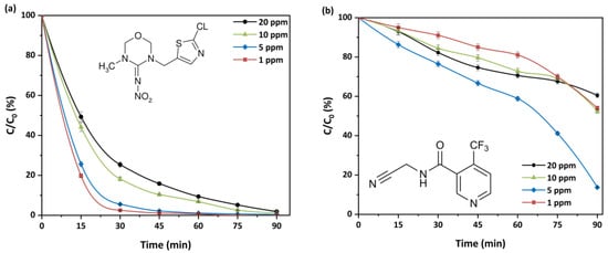 As observed in Figure 1a,b, the data points of all the experimental runs for both pesticides were well fitted, employing an exponential decay model for the TMX, although for the FND, a more linear decay was observed. In addition, the neonicotinoid TMX presented high photodegradation rates, reaching complete removal after 60 min for the diluted solutions (1 and 5 ppm) and 90 min for the more concentrated ones, with no toxic by-product residuals in the solution. As expected, the FND was more resistant to photocatalysis, reaching removal efficiencies ~48% after the photocatalytic experiments, with the exception of the concentration of 5 ppm [31].